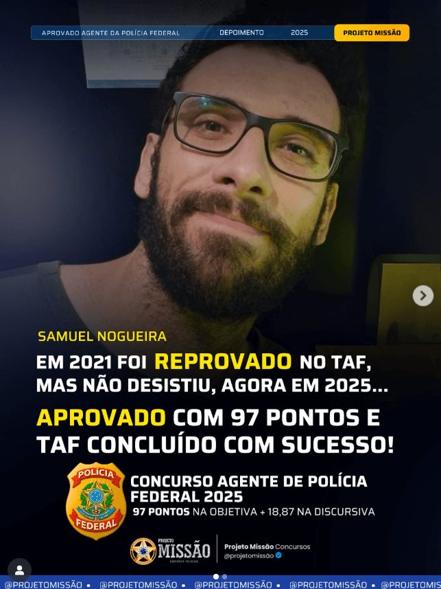 “Passando para deixar meus agradecimentos ao Projeto Missão Concursos. No concurso da PF 2021 já era aluno do Missão, estava aprovado nas vagas, mas acabei caindo no TAF, pois a pandemia dificultou muito meus treinos para a natação.
